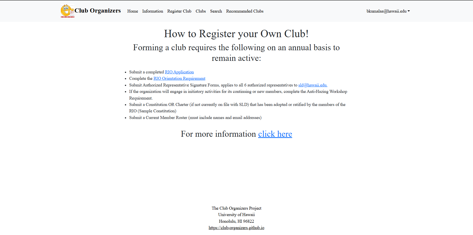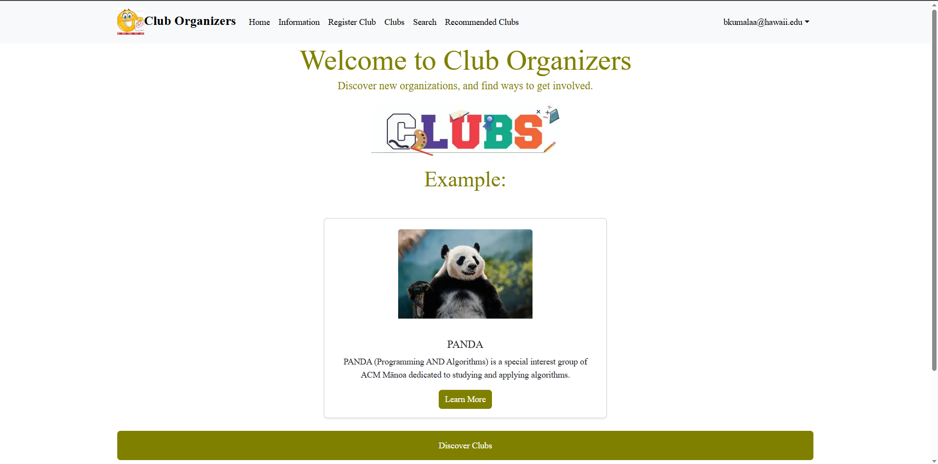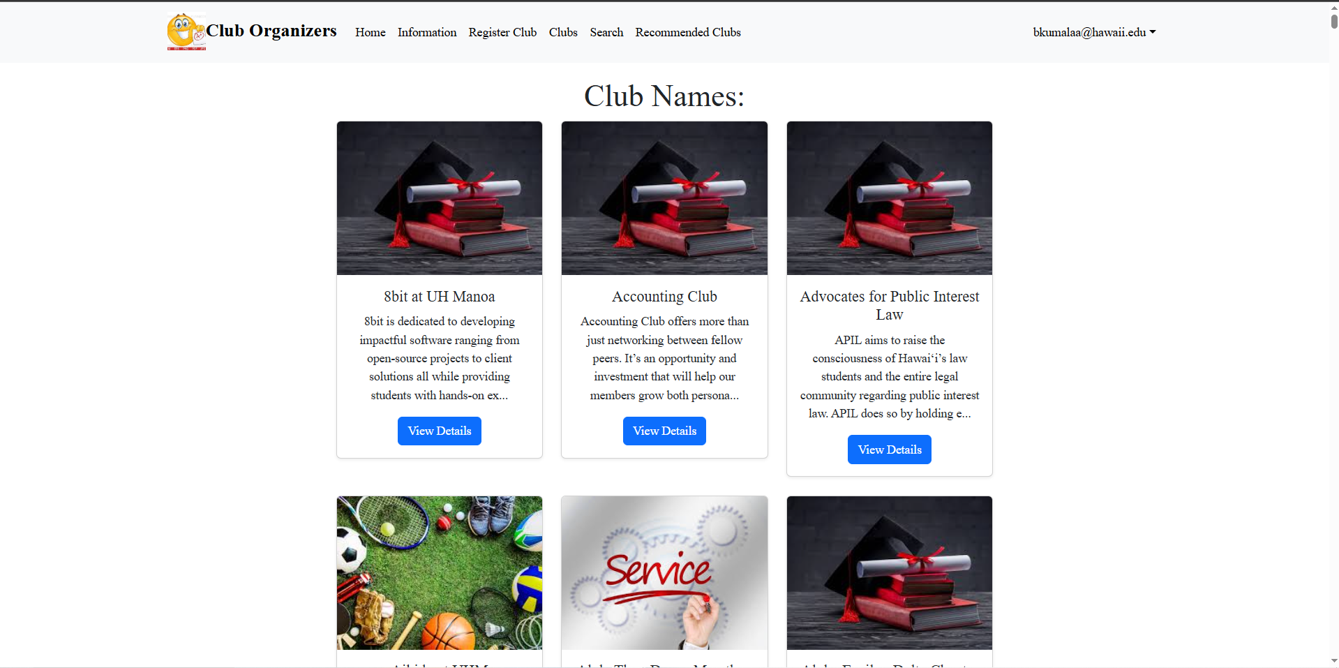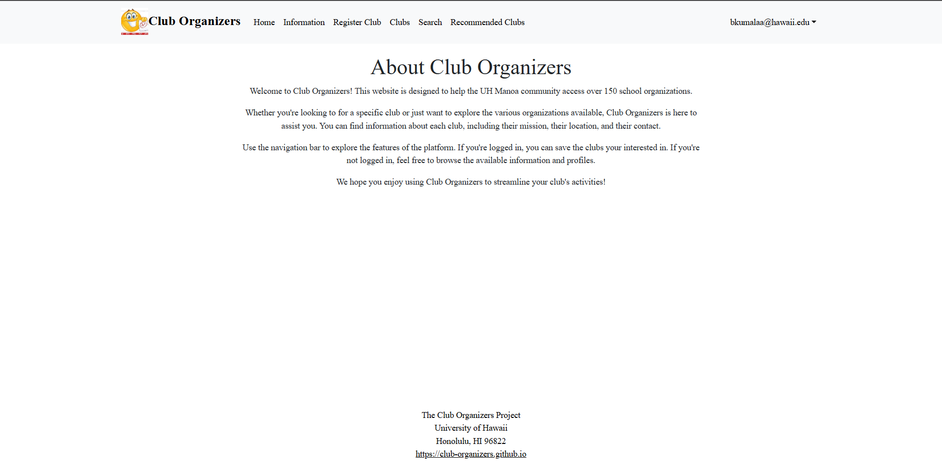 Club Organizers is a centralized platform dedicated to showcasing the diverse range of student organizations at the University of Hawaiʻi at Mānoa. With over 150 Registered Independent Organizations (RIOs) on campus, students have countless opportunities to get involved, connect with others, and pursue their interests. However, finding clear and up-to-date information about these organizations can be a challenge. Club Organizers aims to bridge that gap by offering an easy-to-navigate space where students can discover clubs, access contact details, stay updated on events, and engage with the vibrant UH Mānoa community.