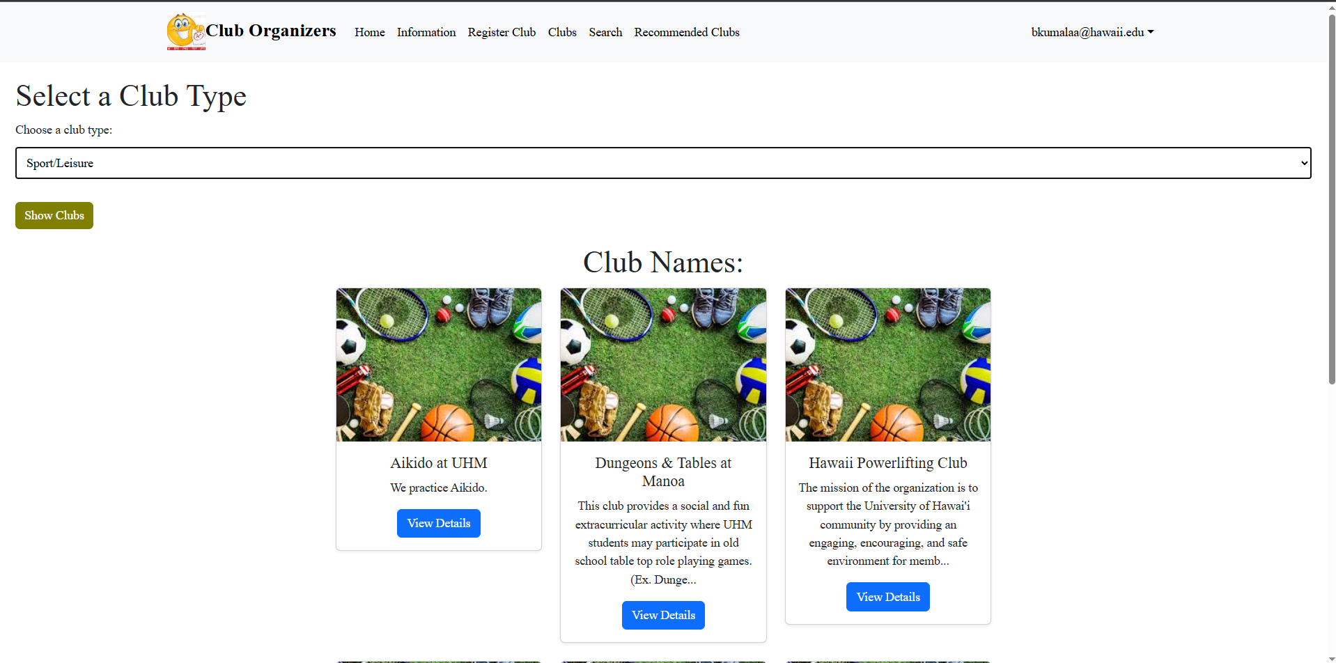 When users sign in and press the Recommended Clubs tab, they can use a drop-down list of the different types of clubs. Users simply select one, and they will be shown all of the different clubs that match said type. If they see a club they are interested in, they can view details about it.