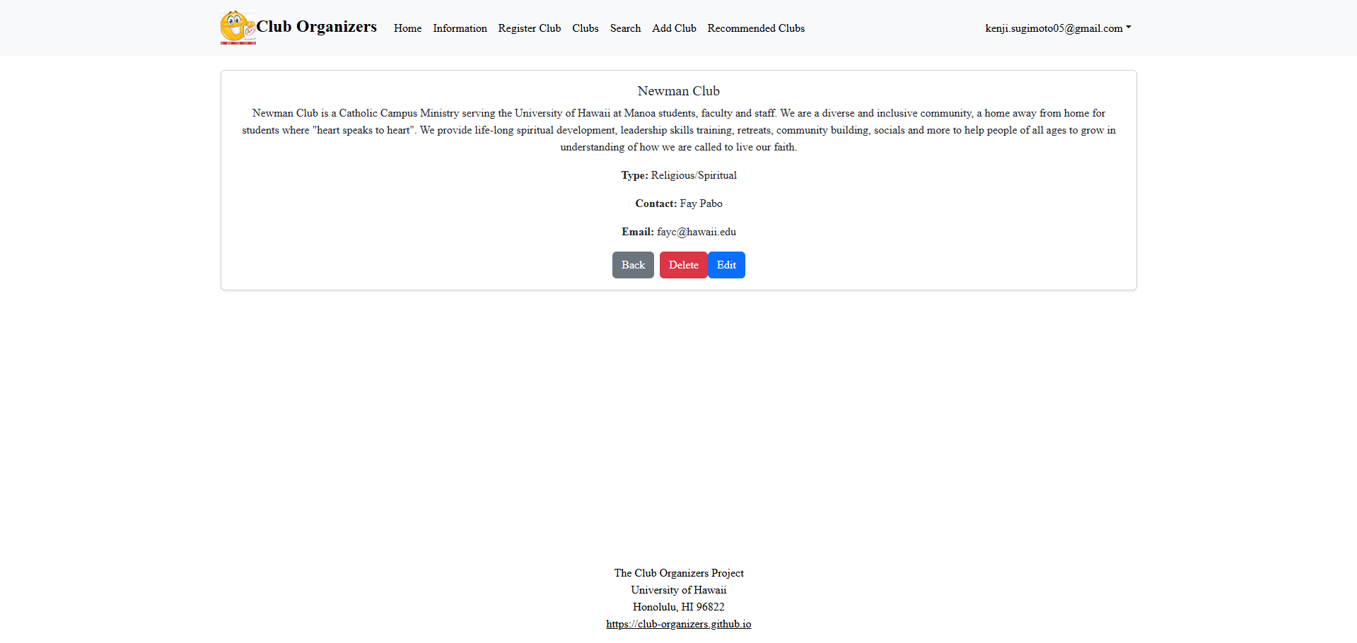 When users find a club that interests them, they can click the View Details button to get some basic information about it. If the user is an admin, they have the ability to delete a club.
